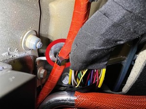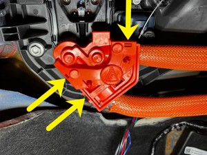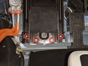 注2x HV joints, Measure both joints at the highlighted locations, The acceptable resistance is between 0.050 mΩ (50 μΩ) and 0.270 mΩ (270 μΩ). If the resistance is greater than 0.270 mΩ (270 μΩ), there is too much resistance in the High Voltage joint. Remove the fastener, clean areas with isopropyl alcohol, install fastener back and test again. If the resistance is lower than 0.050 mΩ (50 μΩ), reposition the probes and measure again. If the resistance is repeatedly between 0.00 mΩ and 0.050 mΩ (50 μΩ), Hioki test passed, proceed to next step.
