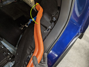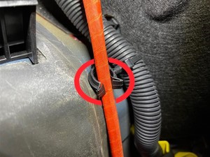 Secure charge port manual release cable onto LH mid C-pillar zone bracket