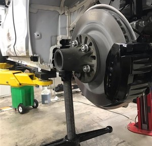 在左后轮毂上安装一个轮毂千斤顶适配器,然后用一个支架将左后轮悬架支撑在行驶高度 (85 mm +/-5 mm)。