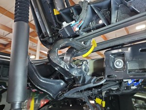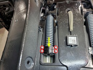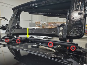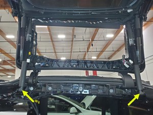 注左侧后车门在中央脊柱上方伸展距离过长;小心不要损坏右侧后车门。注将支撑杆与球形接头对齐,并固定 C 型夹。注进行推拉力测试,以确认支撑杆完全安装。