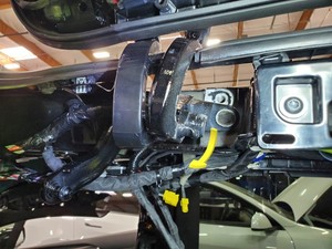 - 将中央脊柱封闭板定位到车内,然后固定将线束固定到中央脊柱封闭板前部的卡子(2 个)。