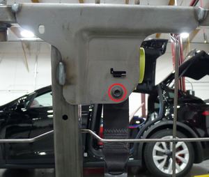 将第二排中央座椅安全带卷收器放到座椅骨架上,然后安装新螺栓,将卷收器连接到座椅骨架。