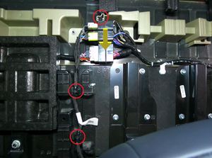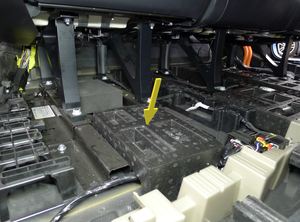 注2 个连接器。先固定好紧急响应回路 (FRL),然后将低压电池放置在连接处,再向内推动黑色连接器锁以进行固定。低压电池完全就位后,再接合好上部锁片