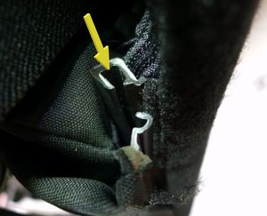 注1 个卡子,4 个锁片,从座椅上拉开以松开卡子,然后从下往上松开锁片,向上提起顶部边缘将其与座椅骨架分离