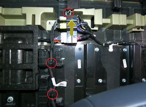注2 个连接器,提起并松开绿色锁片,然后向外拉黑色连接器锁以断开连接,松开紧急响应回路 (FRL) 上的红色锁片