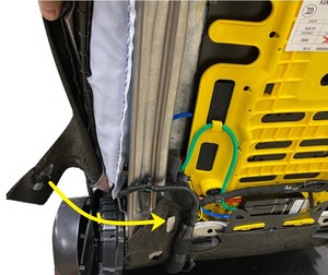 注一个线束用于座垫,另一个线束用于座椅靠背。上部支架用于辅助布线,下部卡子用于固定线束。