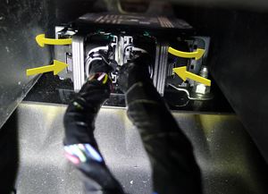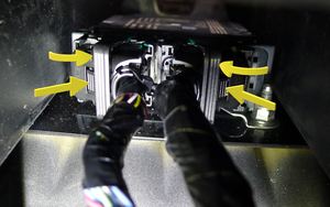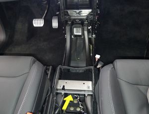 注在中控台支架下方操作,连接好约束控制模块 (RCM) 连接器。向内摆动解锁臂,确保锁片接合。