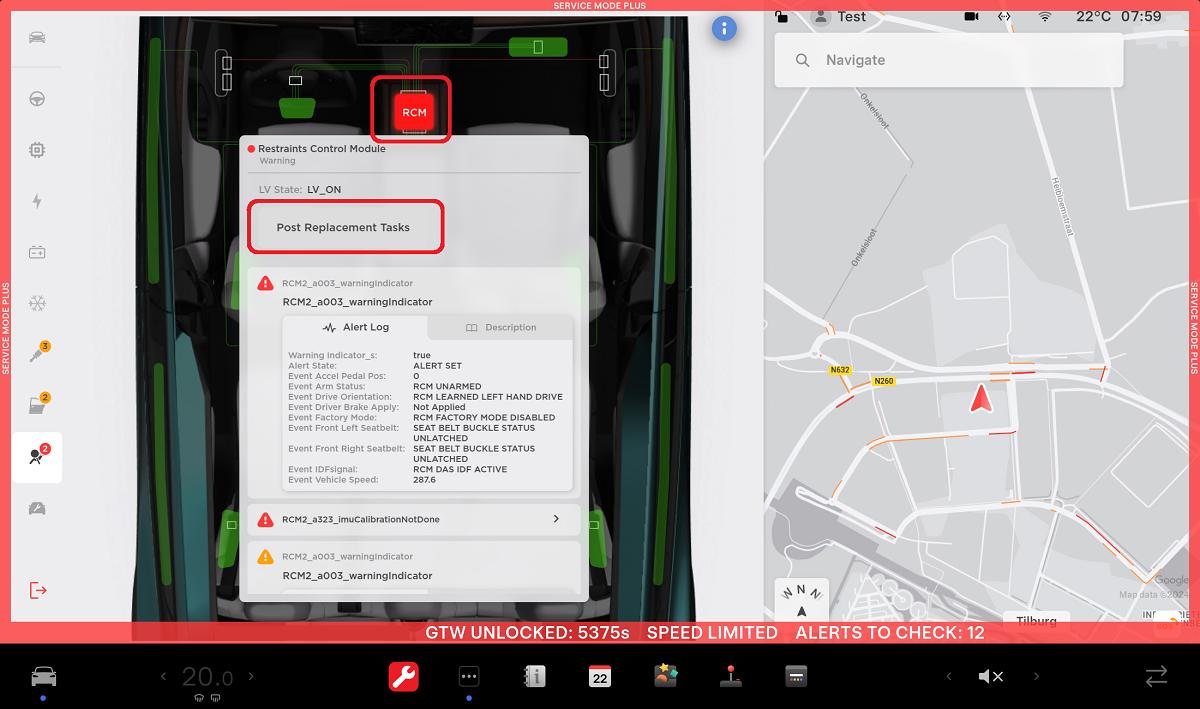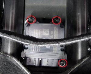 - 将新的约束控制模块 (RCM) 放置在车辆上,然后安装将约束控制模块 (RCM) 固定到车辆的螺母(3 个)(扭矩 10 Nm)。