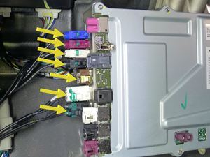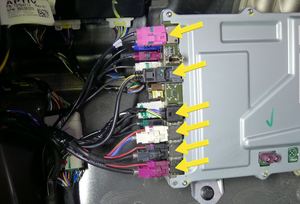 注2 个连接器;提起并松开绿色锁片,然后向外拉黑色连接器锁以断开连接,松开紧急响应回路 (FRL) 上的红色锁片