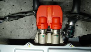 注2 个弹簧锁;在车载电脑周围放置冷却液吸收垫或抹布,拆下冷却液塞,确保弹簧锁锁好并对每个软管接头进行拉推拉测试
