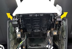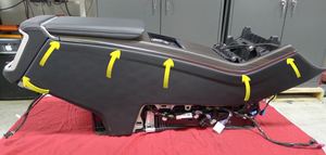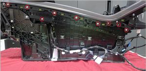 6 个固定销,1 个连接器,划入后部亮条然后将其向下滑入中控台总成,确保 6 个固定销均固定,亮条无错位
