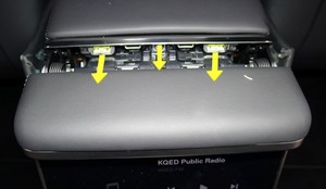 4 个卡子,2 个固定销;将底部向上拉,然后摇动着将其从仪表板下面拉出