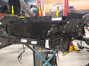 小心地将中控台总成前端向下安装至仪表板托架内,并将其后端下降到位。如有需要,建议请助手帮忙