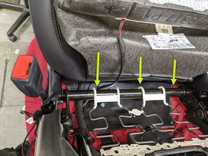 注1 个卡子,1 个支架;一条线束用于座垫,另一条线束用于座椅靠背。上部支架用于辅助布线,下部夹子用于固定线束
