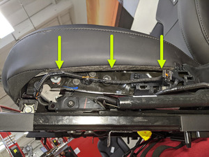 从座椅上拆下前排座垫 (FSC) 和前排座椅靠背 (FSB) 通风加热垫线束