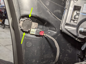 - 松开锁片(2 个),然后将左前外侧驻车距离传感器从前饰板总成上拆下。