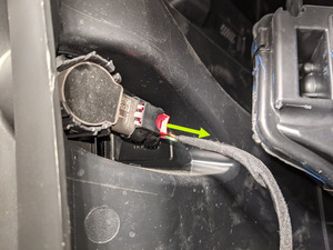 连接左前外侧驻车距离传感器电气连接器,然后接合锁片。