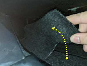 - 从前端开始,将后备箱毡毯提起放到鱼叉形支架上方,将毡毯滑到行李箱侧饰板下方,然后穿过掀背车门拆下毡毯。