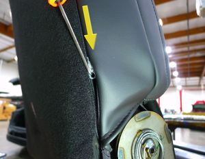 注5 个卡子,2 个 Velcro 扣带,将靠背罩折叠越过头枕以方便后续操作。