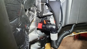 从前驱动单元 (FDU) 热交换器连接软管断开左侧门槛至前备箱软管