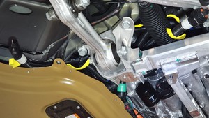 注安装时,将冷却液塞安装到前驱动单元热交换器连接软管端;将冷却液软管从高压电池和车身之间穿过后,立即将塞子安装回侧门槛回流软管端;安装时注意软管的方向