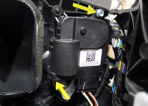 卸下将左侧吹脸执行器连接到暖通空调 (HVAC) 总成的螺钉(2 个),然后从总成上拆下执行器。