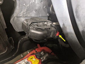 注拉动红色锁片进行解锁,然后再次拉动以松开电气连接器。切勿向下按红色锁片。