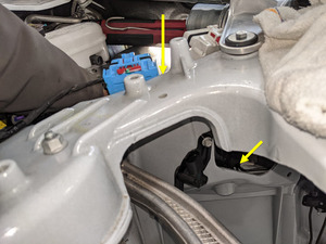 - 将液压控制单元电子控制单元 (HCU ECU) 线束和连接器穿过车身后穿入轮舱。