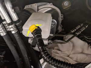 - 清洁制动液储液罐周围的区域,然后拆下制动液储液罐盖。
