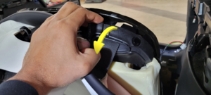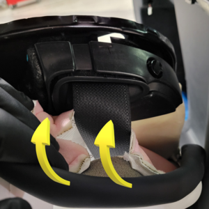 注将座椅折叠到一个可操作的位置,从 J 钩夹的一端开始,将卡子向内折叠,直到饰面的另一端完全塞入
