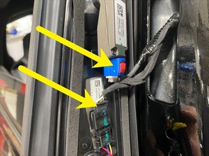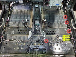 2 个连接器。先固定好紧急响应回路 (FRL),然后将低压电池放置在连接处,再向内推动黑色连接器锁以进行固定。低压电池完全就位后,再接合好上部锁片