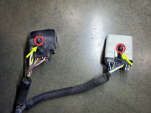 2 个连接器;提起并松开绿色锁片,然后向外拉黑色连接器锁以断开连接,松开紧急响应回路 (FRL) 上的红色锁片