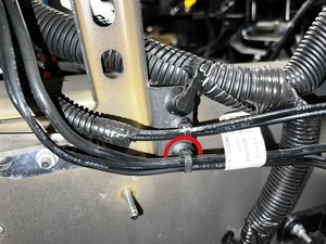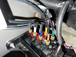 注准备安装空气管路时,取下白色塞子。注将空气管路完全插入到接头中。它应该位于空气管路上的两个白色标记之间。通过进行推拉测试,确认空气管路已正确地安放。 - 紧固将前管束固定到右减震塔总成的卡子。