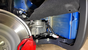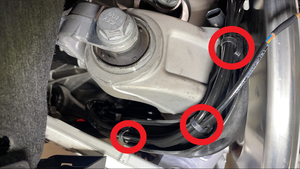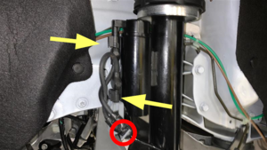 - 从左后主动减振器上断开副框架线束电气连接器(2 个),然后松开将线束连接到车辆的索环