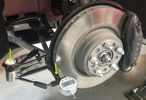 注5 个螺母注这将模拟正在安装的车轮,从而防止测量不准确。 - 将制动盘偏转挠性杆安装到前横拉杆螺母上并设置用于读取。