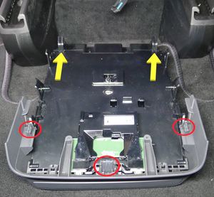 松开将中控台后部杯托总成固定到中控台上的卡子(3 个),垂直向下拉动杯托后部,然后旋转,露出中控台下部框架上的固定销(2 个)。