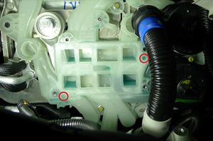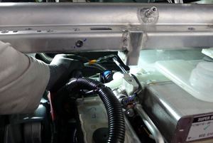 松开左侧减震塔盖板上方的前围篦板清洗剂供给软管。
