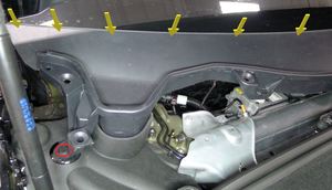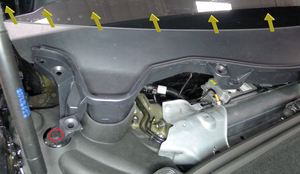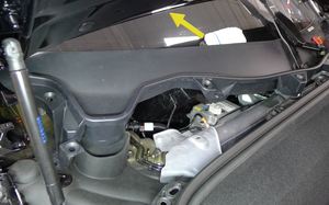 - 松开将前围篦板右侧固定到车身的卡子,抬起前围篦板右侧,在挡风玻璃和前围篦板之间塞一条卷起的干净车间毛巾。