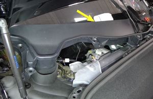 - 松开将前备箱盖外侧右铰链盖固定到前围篦板的卡子,然后将铰链盖从前备箱盖右铰链和前围篦板周围拆下。