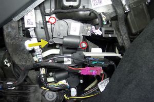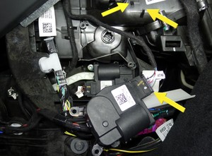 拆下固定 2R 旁路 HVAC 执行机构的螺钉,并从 HVAC 总成上拆下此执行机构