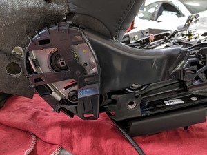 - 将前排座椅侧护板右侧支架放置到左侧前排座椅上,然后将支架向前滑到框架上,以对齐卡子(2 个)和锁片(3 个)。