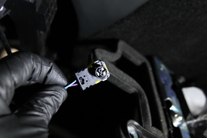 固定左侧暖通空调 (HVAC) 底板执行器和左侧底板风管温度传感器连接器。