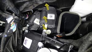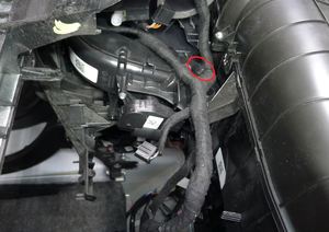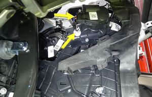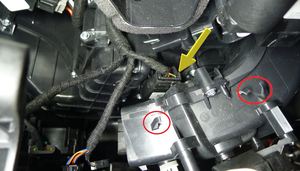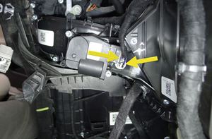 固定左侧暖通空调 (HVAC) 面板执行器和除霜温度传感器连接器。
