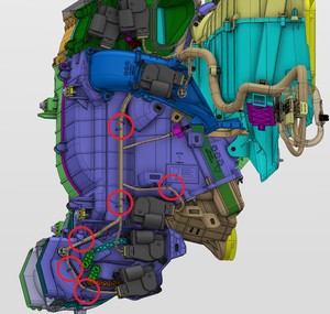 注1 个卡子,3 个连接器,6 个锁片。放置到位前勾上锁片。小心操作,以免损坏连接器/线束。连接连接器时,需支撑膝部气囊。
