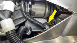 - 紧固将后驱动单元变流器进口软管固定到变速箱左侧的卡子。