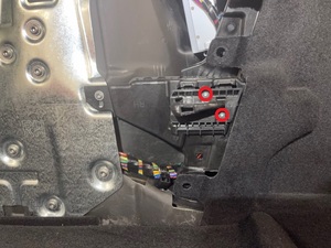 将后备箱右侧负重底板支架放入车内,然后安装将支架连接到车辆的螺钉(2 个)。