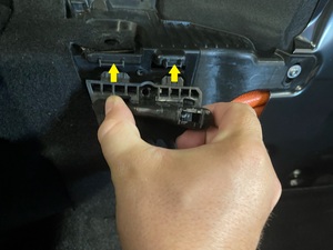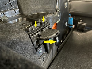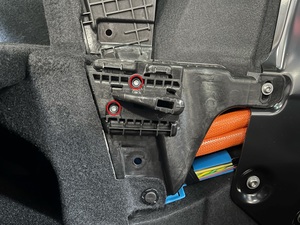 将后备箱左侧负重底板支架放入车内,然后安装螺钉(2 个)并固定将支架连接到车辆的锁片(2 个)。