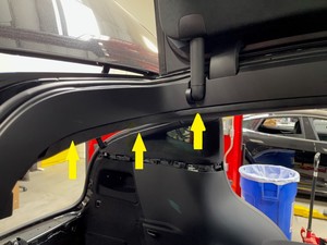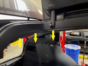 - 将掀背尾门右后夹条总成安装到掀背尾门上,然后用推拉式卡子(3 个)紧固夹条。