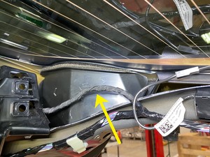 - 使掀背尾门线束穿过掀背尾门顶部索环孔,然后用夹子(17 个)紧固线束。