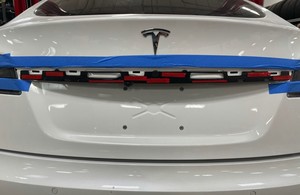 - 将掀背尾门左后夹条总成安装到掀背尾门上,然后用推拉式卡子(3 个)紧固夹条。